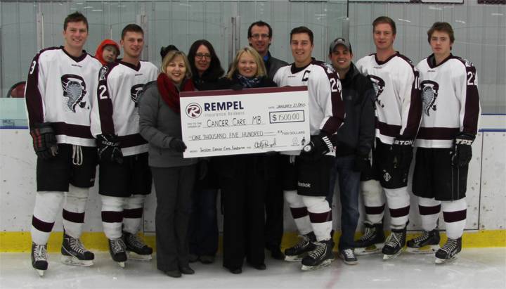(Corey Mazinke, Matt Mazinke, Cheryl Gemmell, Robyn Collette, Lynn Rempel, Shawn Graydon, Paul Remillard, Jeff Landry, Jamie Vanderlinde, Tyler Penner) Rempel Insurance stands tall with Pembina Valley Twisters in the fight against cancer. January 23-25, 2015 is the Cancer Care Weekend at the Morris Arena and Team Rempel has started the fundraising with a donation …